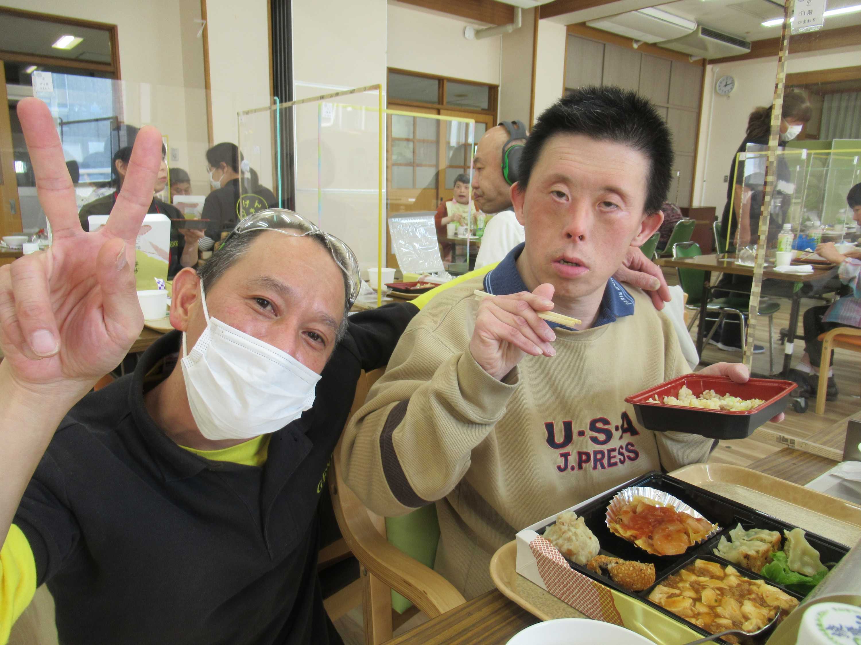食事は、いつもお世話になっている中華レストラン『風の音』の中華弁当!中身は皆さまのリクエストに応じたメニュー!本格的な中華のお供は、げんきの皆さまが美味しいと太鼓判の、カナールのケーキをご用意致しました!ゆっくり楽しく食事をして、皆さん満腹になりました!