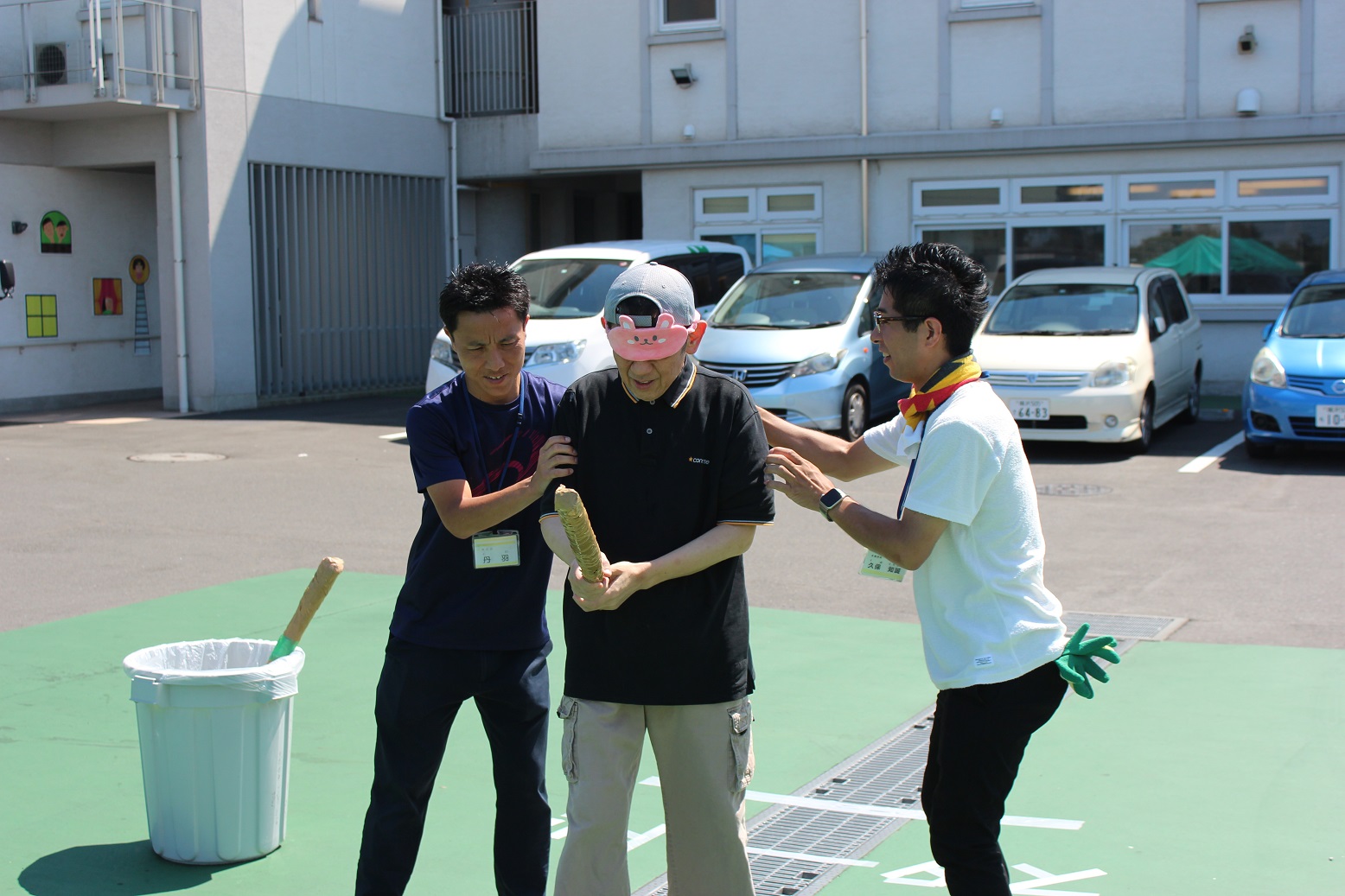 なかなか割れずに何度も挑戦する方、力いっぱい地面をたたく方、優しくスイカをたたく方や力いっぱいスイカ割ることが出来た方など、温かい声援や歓声につつまれ、皆さんすいか割りを楽しまれていました。