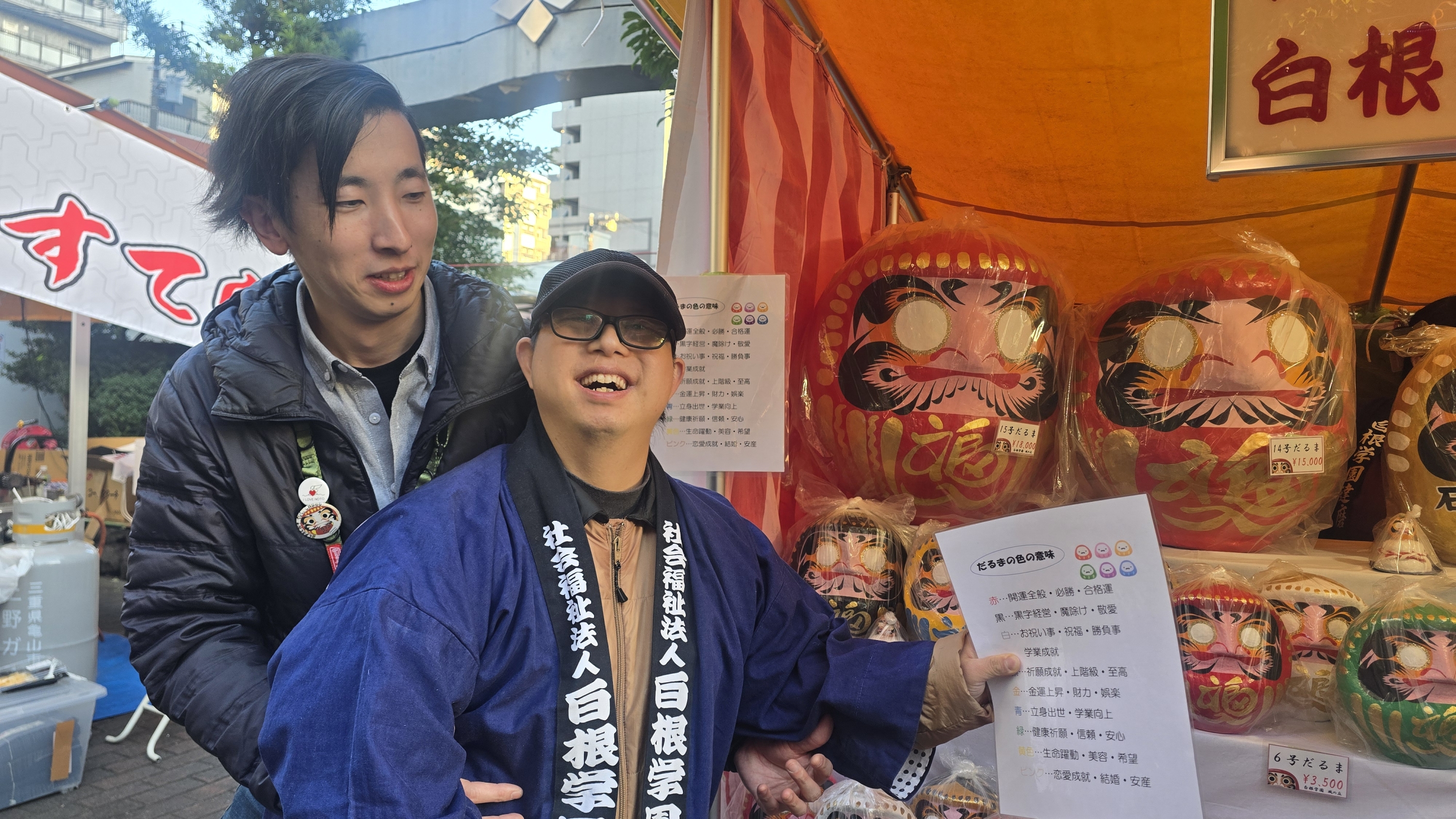 出店日は11月12日と24日の2日間。利用者の皆さんと一緒に、心を込めて作ったダルマをたくさん並べることができました。