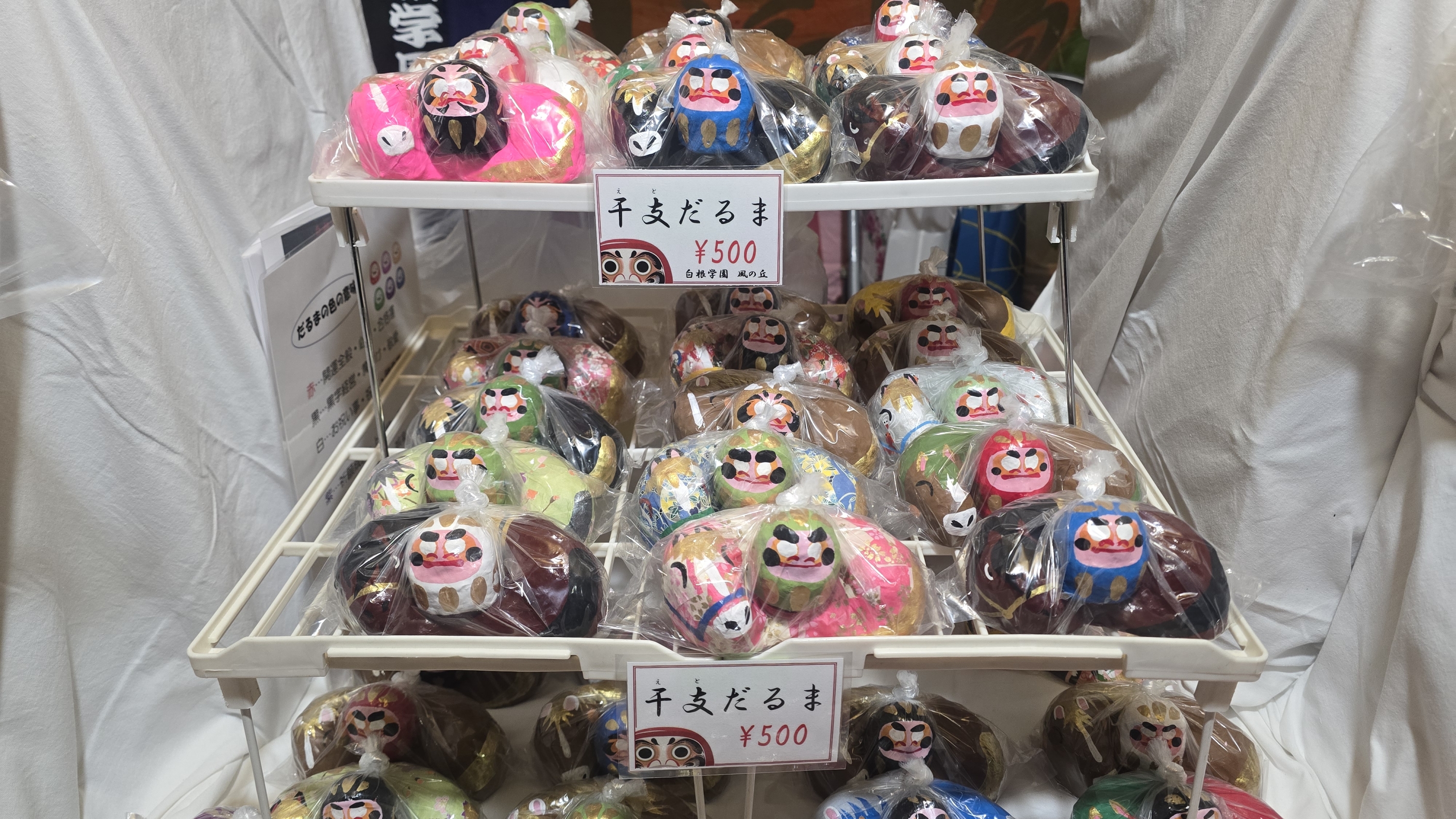 今年は新しい色として「ピンクのダルマ」を初めて制作しました。やさしく明るい色合いが好評で、「かわいいですね」「この色は初めて見ました」と声をかけていただくことも多く、とても人気がありました。
